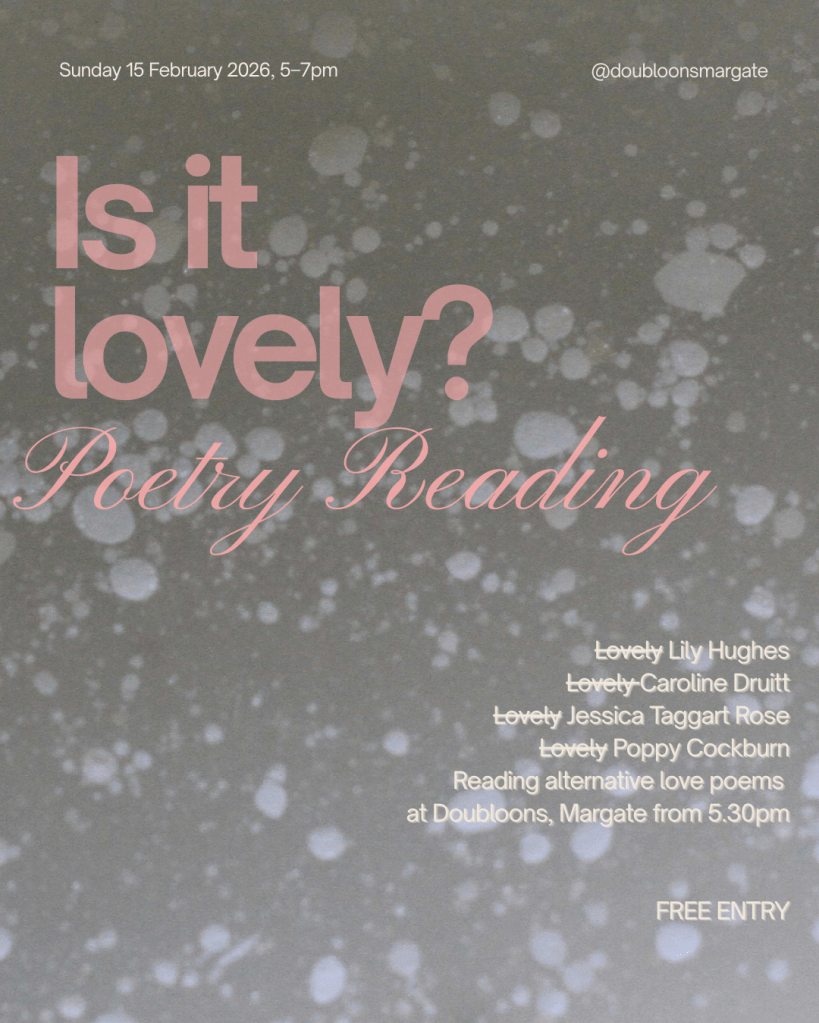 The next episode of my live reading event Is it Dirty? will take place in Spring 2026. A Valentine’s spin-off, Is it Lovely? will happen at Doubloons, Margate on Sunday 15 February 2026, 5–7pm. Readers include Caroline Druitt, Jessica Taggart Rose, Lily Hughes and myself.